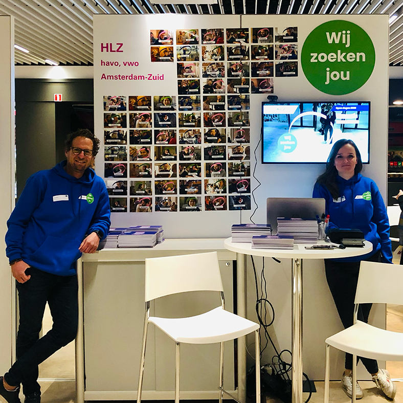 Ieder jaar staan alle middelbare scholen van Amsterdam in de ScholenArenA. Dit is voor achtstegroepers vaak de eerste kennismaking met de middelbare scholen. Iedere school krijgt een eigen stand. De stand van het HLZ hebben we dit jaar volgeplak met foto’s van leerkrachten, medewerkers en leerlingen van het HLZ en een persoonlijke eigenschap. Zo krijgen de achtstegroepers meteen een beeld bij wie er op de school rondlopen. En dat echt iedereen welkom is: van speurneuzen tot stille genieters.