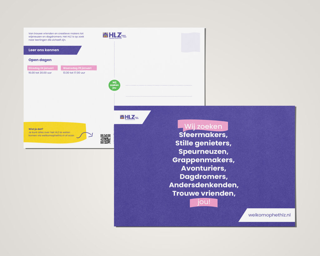 Een imago-verandering gaat natuurlijk niet over één campagne. Daarom zijn we ook gestart met het ontwikkelen van een impactplan, een richtinggevend merkkompas, de en visuele identiteit. Dit traject loopt gelijk op met de campagne om nieuwe leerlingen voor het schooljaar 2022-2023 aan te trekken. Deze campagne ontwikkelen we in de huidige identiteit van HLZ, maar in een nieuw jasje.